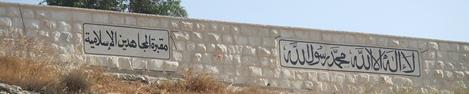 The left sign says “Islamic Cemetery for the Mujahideen (or Freedom Fighters)”.