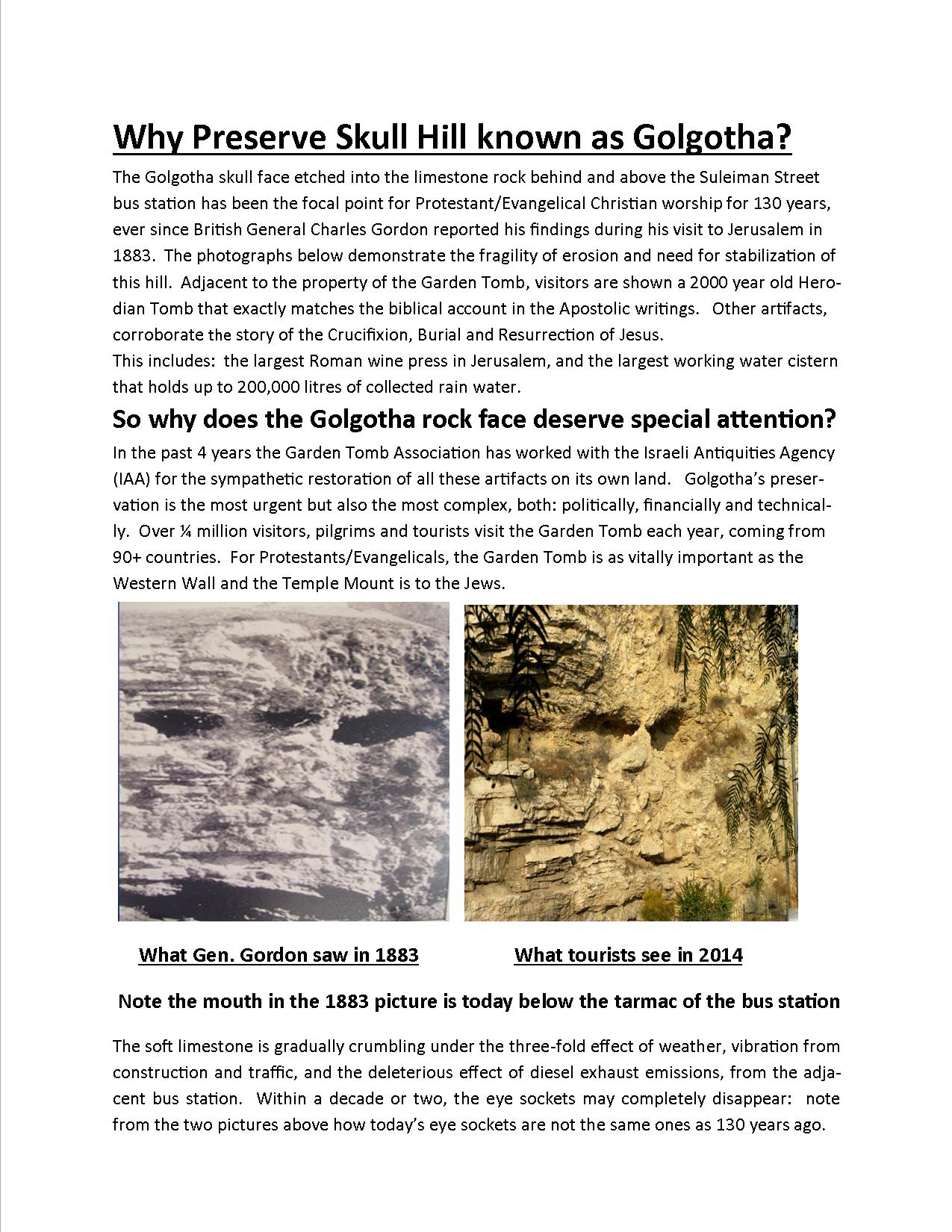 The fund raising stage has begun. We are thankful for this letter from the Israel Antiquities Authority endorsing the preservation of both Golgotha (the place of the skull) and the adjacent Garden Tomb.